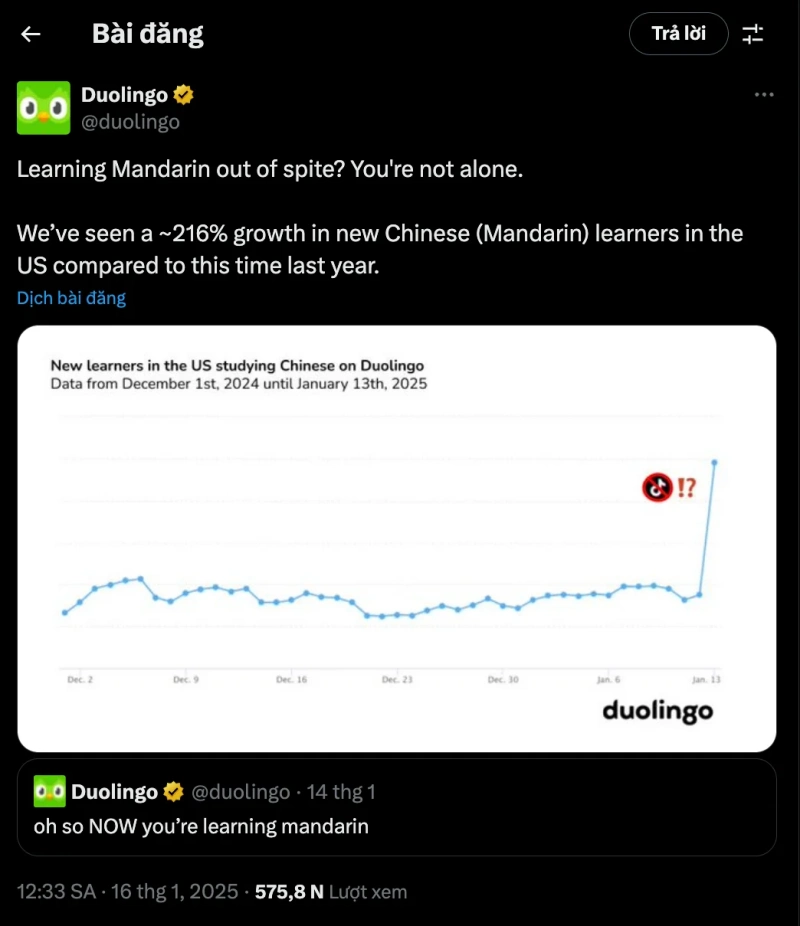 Báo cáo của Duolingo về số lượng người dùng Mỹ đổ xô đi học tiếng Quan Thoại đã tăng đột biến đến ~216%. Nguồn: Tài khoản X (Twitter) @duolingo.